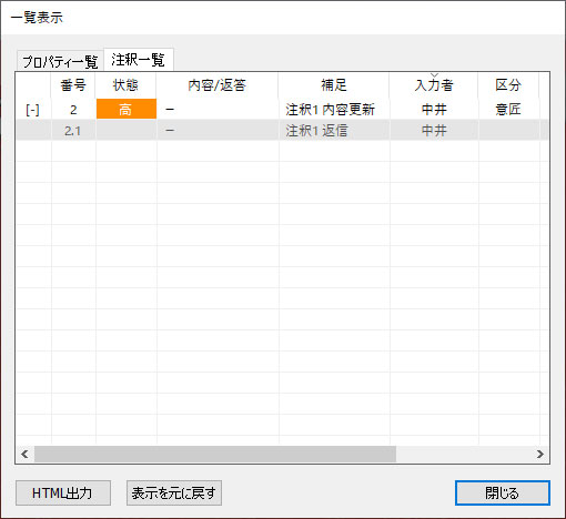 表示させたい項目をチェックして「確定」を押すと項目に合致する注釈のみViewerと一覧表示ダイアログに表示されます。